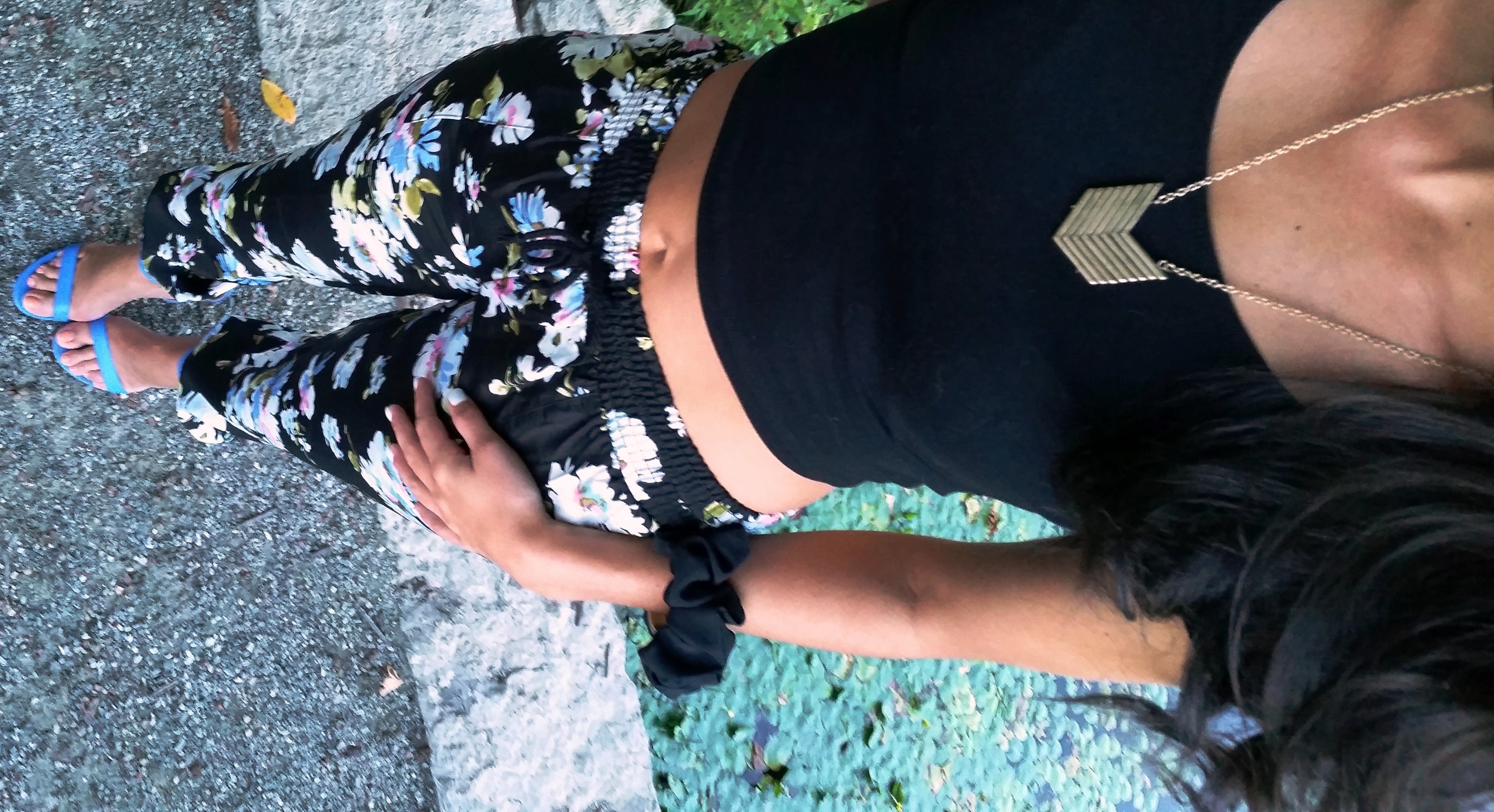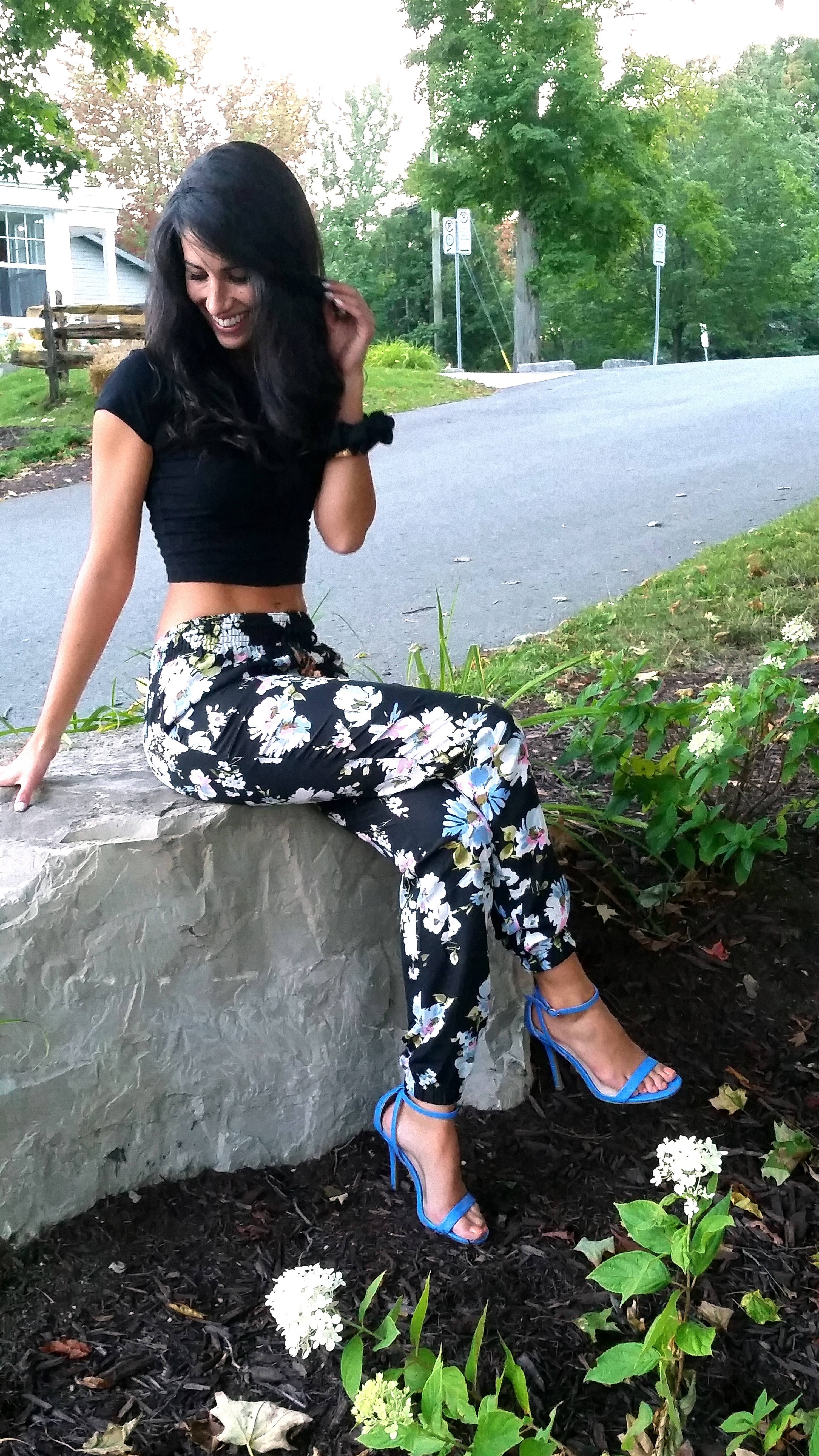 L’automne est à nos portes, l’été pratiquement fini… Comme je ne suis pas prête à ça ! Le beau temps continue de pointer le bout du nez donc pas question de sortir les vêtements de la prochaine saison. J’ai décidé d’enfiler mes pantalons bouffis à fleurs et mes talons hauts bleu néon. Il est rare de me voir porter des couleurs aussi voyantes mais l’occasion était parfaite (j’ai tout de même opté pour un haut noir afin de rester dans mon élément, oupsi).