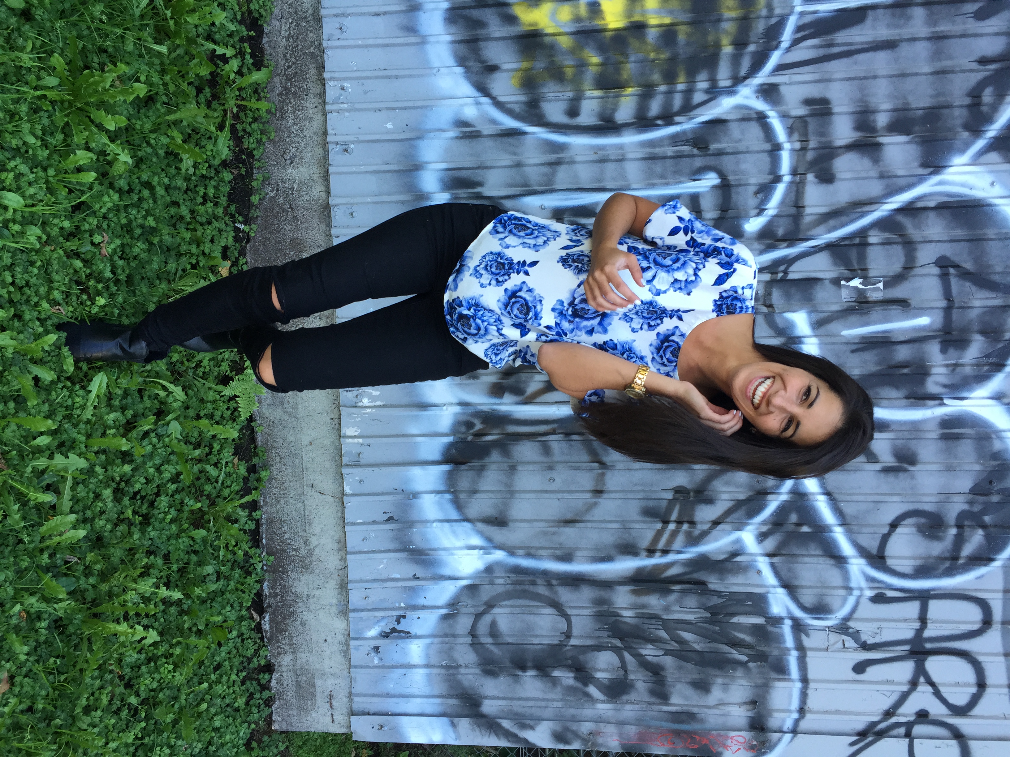 Le temps s’est finalement rafraîchit et m’a obligée à sortir mon must de l’automne : mon jeans troué. Je me revois quelques années auparavant lorsque je l’enfile car combien j’aimais ça en porter au temps du secondaire… avec pratiquement plus de trous que de tissus. Mais celui-ci est plus classe avec sa couleur noire et ses petites lignes coupées au niveau du genou. Ce jeans peut facilement s’agencer avec un haut de forme carrée (aussi long que large) et d’une ceinture étroite en cuir. Avec le soleil qui vient contraster avec le vent du nord, je n’ai pas pu résister à mon T-shirt blanc avec ses grandes fleurs bleues pour rappeler que l’été était encore hier.