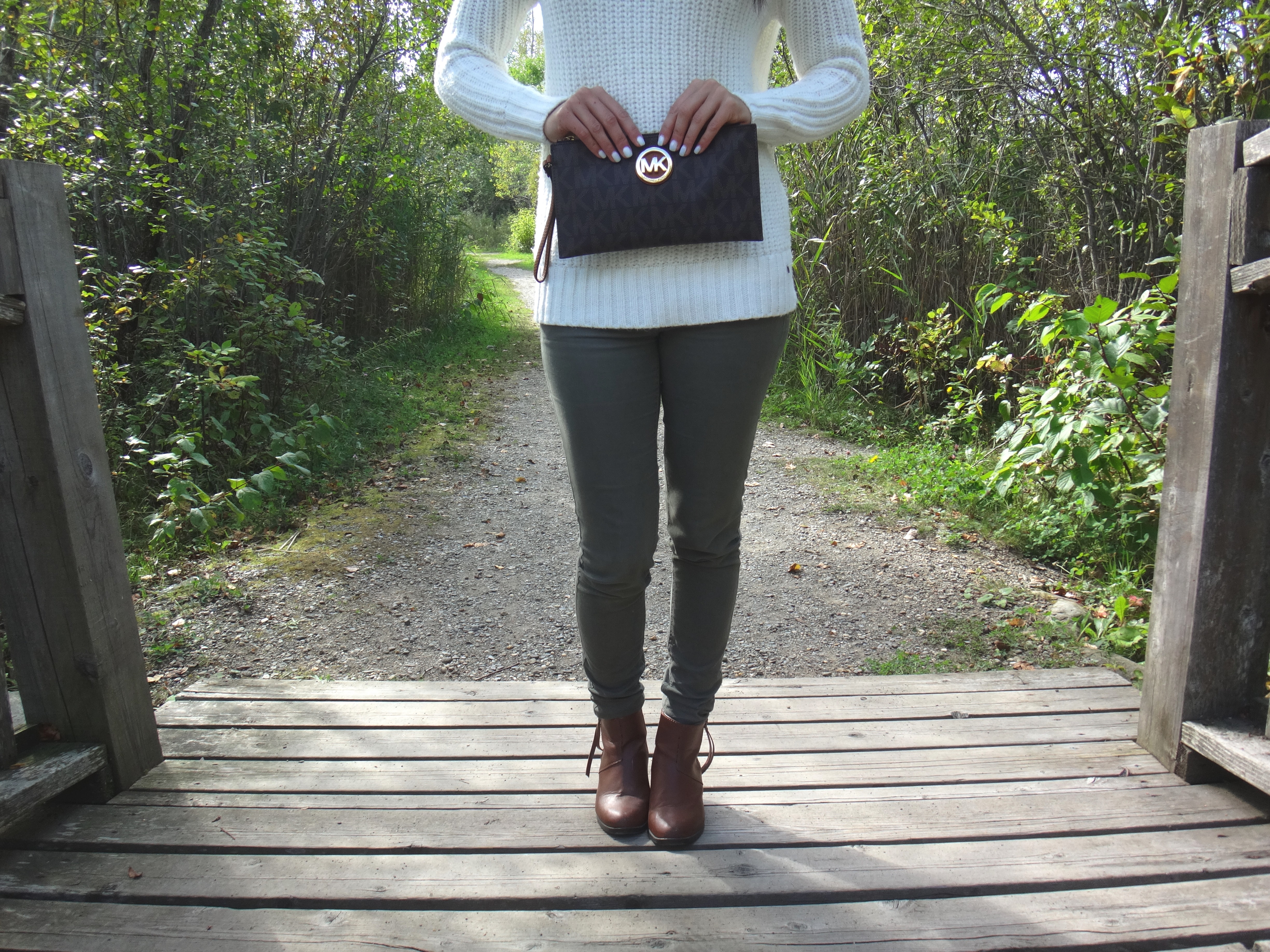 Le tricot blanc vient parfaitement s’agencer avec un pantalon kaki et un bottillon de couleur tan, encore une fois coupé à la cheville. J’ai opté pour des accessoires dorés pour rappeler les dernières chaleurs ainsi que le changement de couleurs des feuilles dans les arbres.