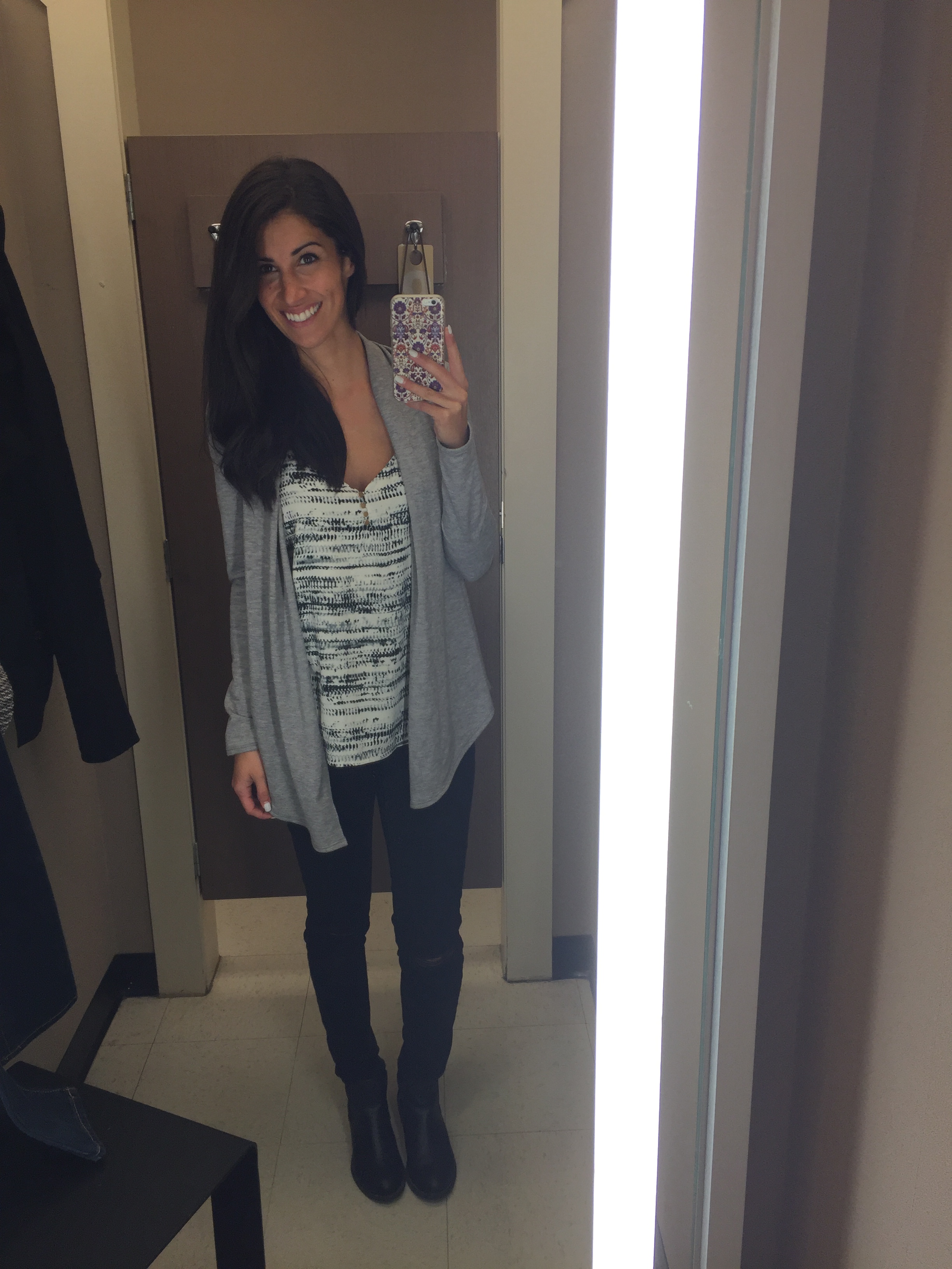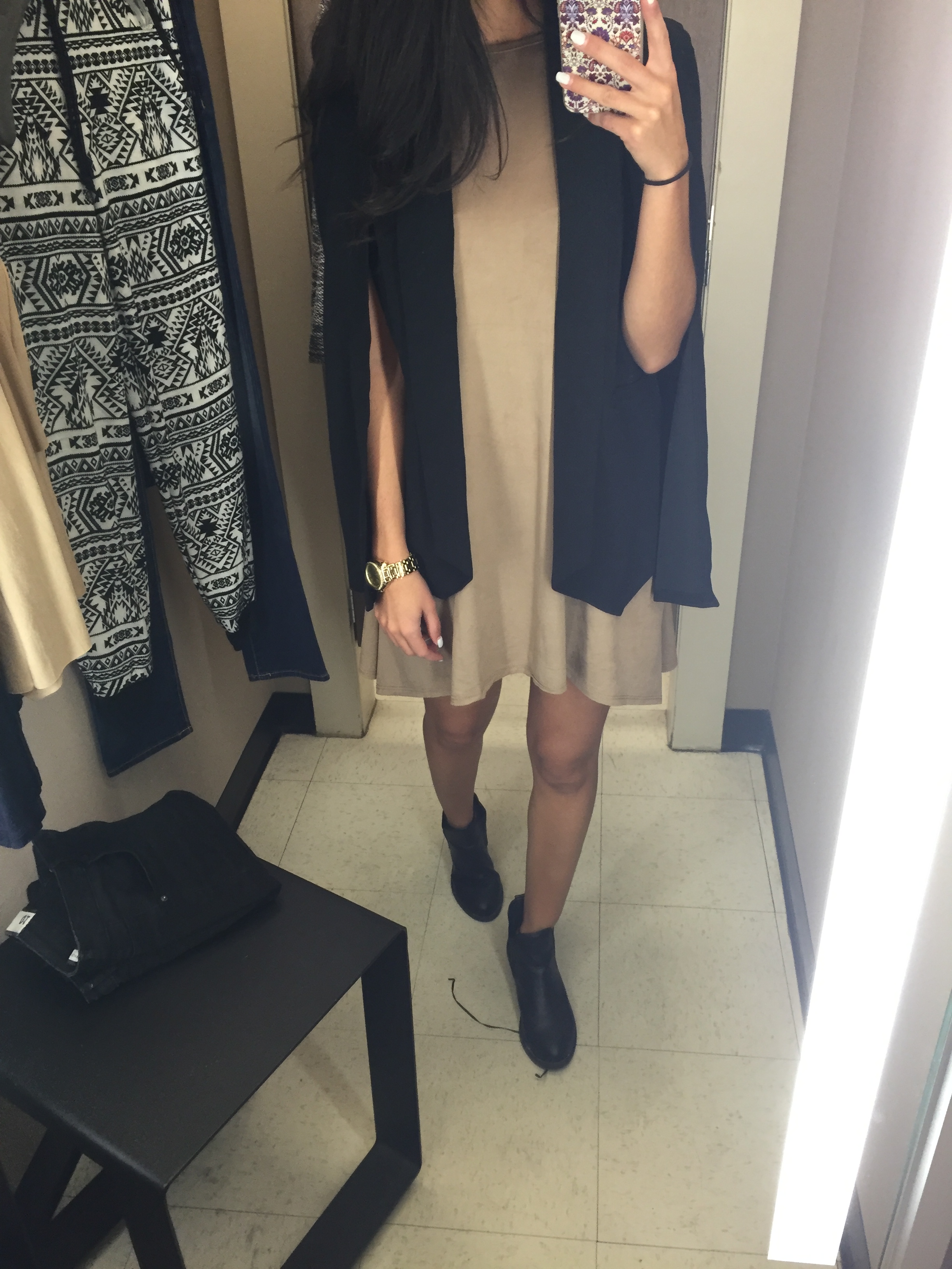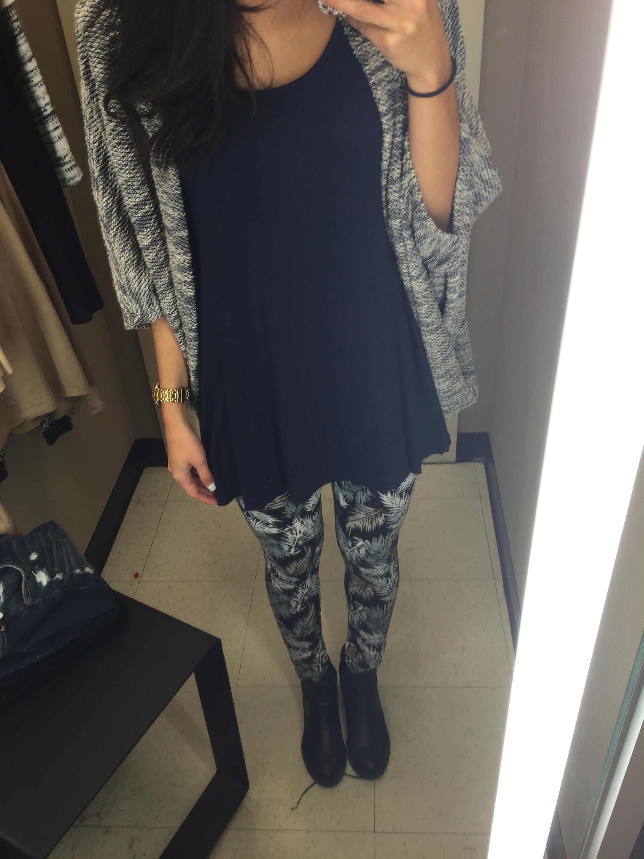 Tout en faisant les allées, je gardais en tête les couleurs prisées de l’automne et je regardais des items plutôt basics pour pouvoir faire plusieurs looks avec les mêmes vêtements. À un moment, j’avais de la difficulté à soutenir les supports que j’avais dans les mains, c’était le signe qu’il fallait me rendre dans une salle d’essayage.