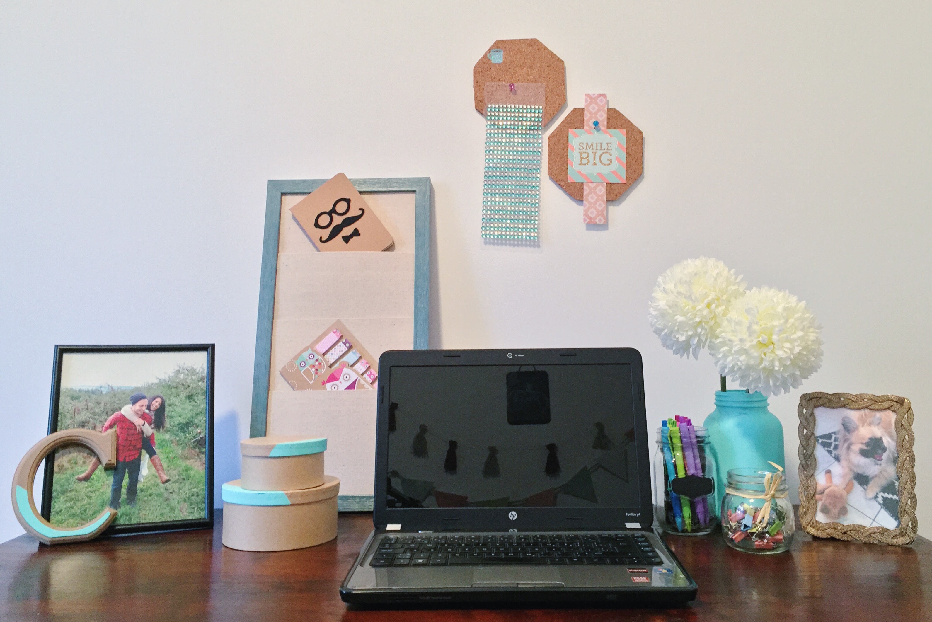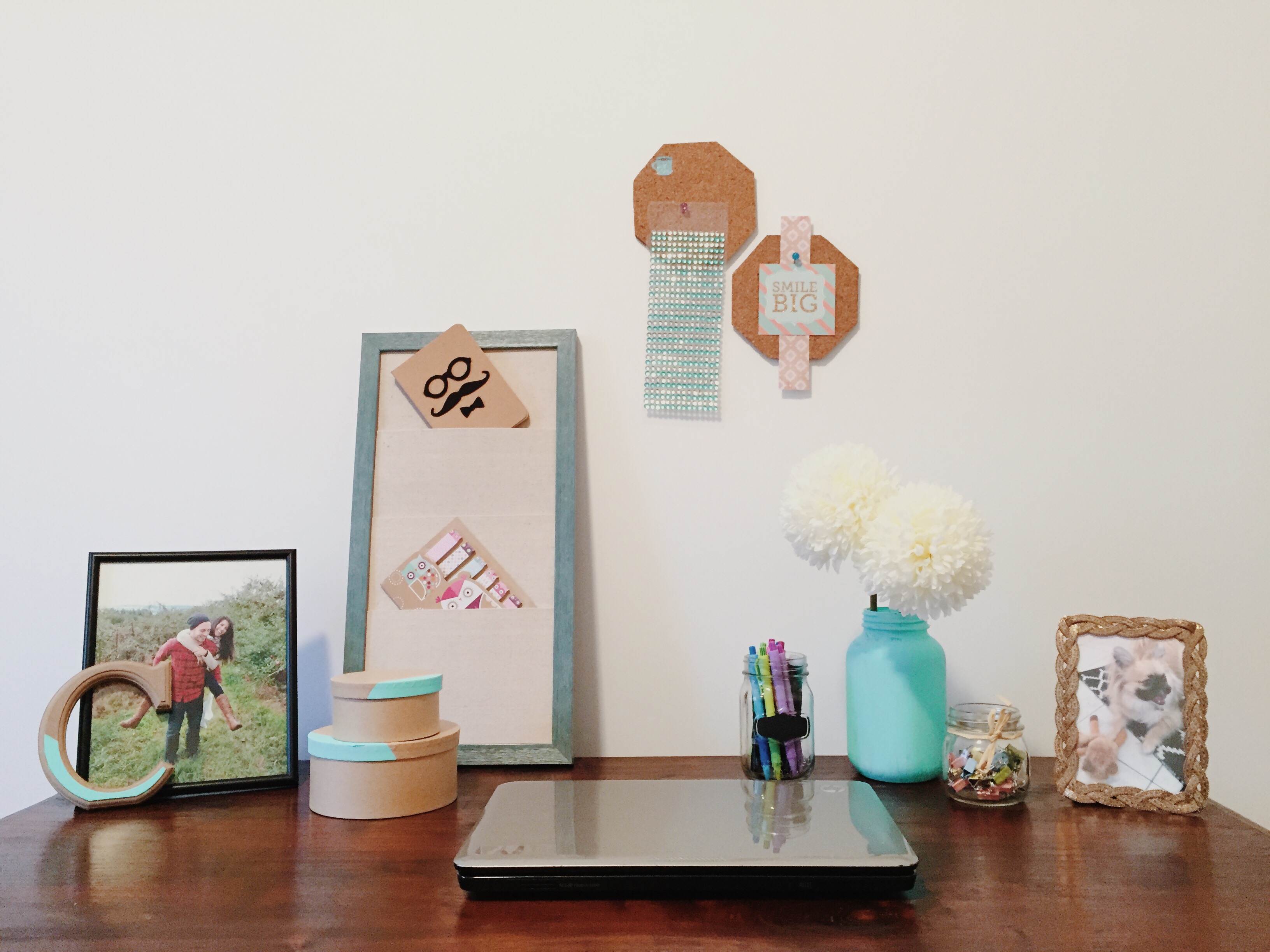 L’objet dont je me suis inspirée pour trouver la thématique est le cadre en bois turquoise que j’ai trouvé chez HomeSense avec des pochettes en tissus (il a les mêmes au Michael). Il fait rustique s’agençant bien au bois foncé du bureau tout en amenant de la couleur à la pièce. Puis, j’ai découpé des octogones dans une feuille de liège que j’ai fixé au mur pour me permettre de libérer mon bureau d’images ou de collants qui auraient tendance à être à la traîne. En voyant le résultat, je pense bien en faire quelques-uns de plus pour mettre davantage l’accent sur le mur. Côté accessoires, j’ai encore fait les allées du Dollorama où j’ai acheté des boîtes en carton, des pots Masson, des crayons et la lettre C en bois. J’ai aussi emporté de la peinture turquoise à laquelle j’ai ajouté beaucoup de blanc pour donner cette teinte éclatante et qui a permis d’associer tous ces items au décor.