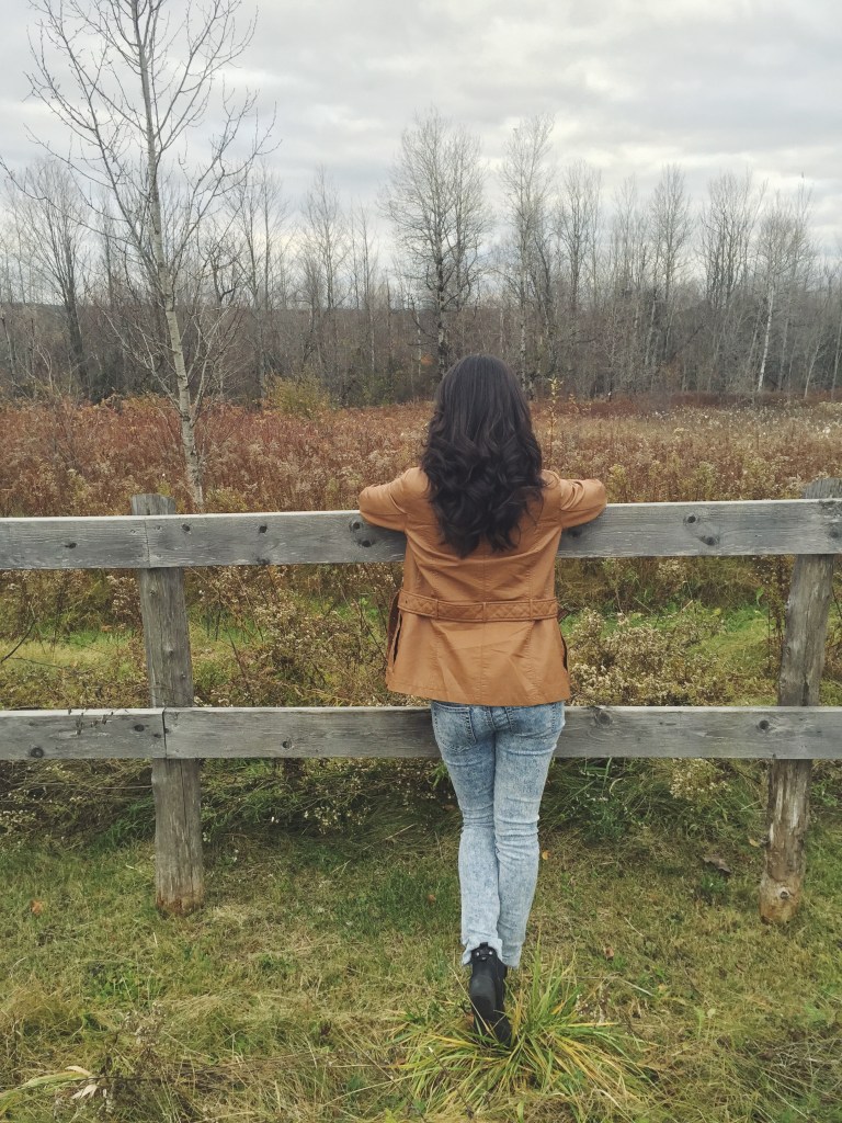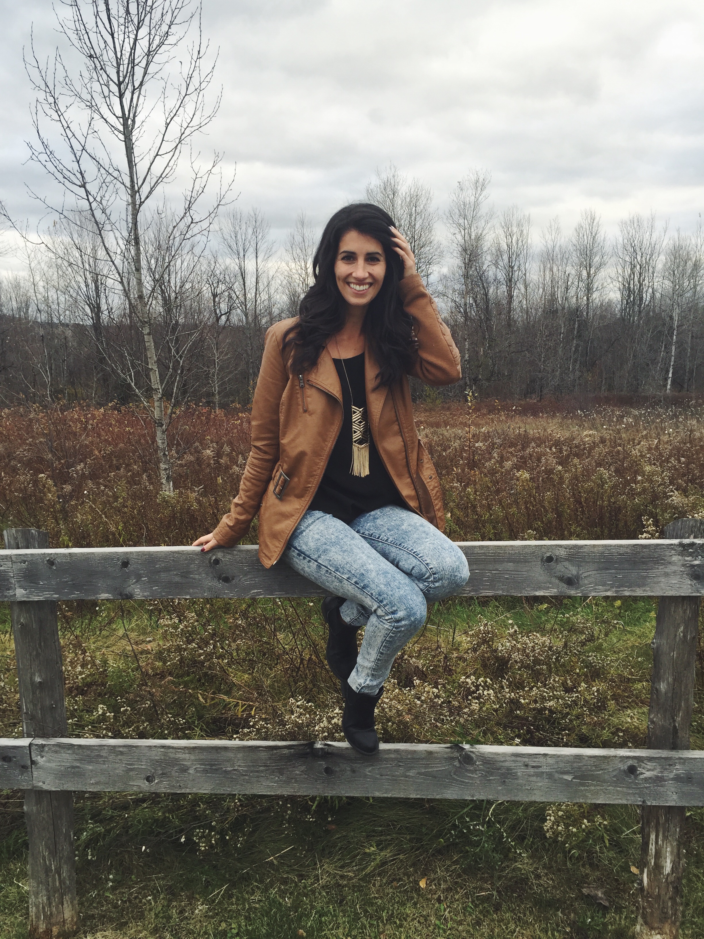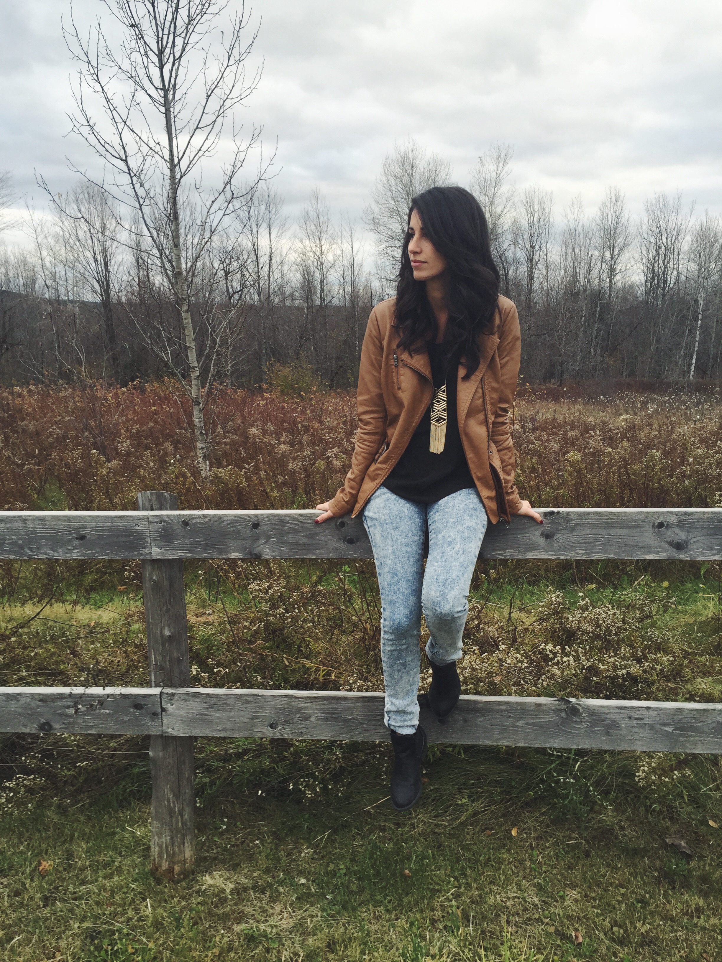 La température plutôt clémente m’a fait optée pour un jeans deux couleurs avec un simple T-shirt noir et mon collier plaqué or qui rappelle les designs Aztèques. Un petit manteau en faux-cuir couleur tan venait compléter mon ensemble pour me fondre dans le décor des prés et de la forêt.