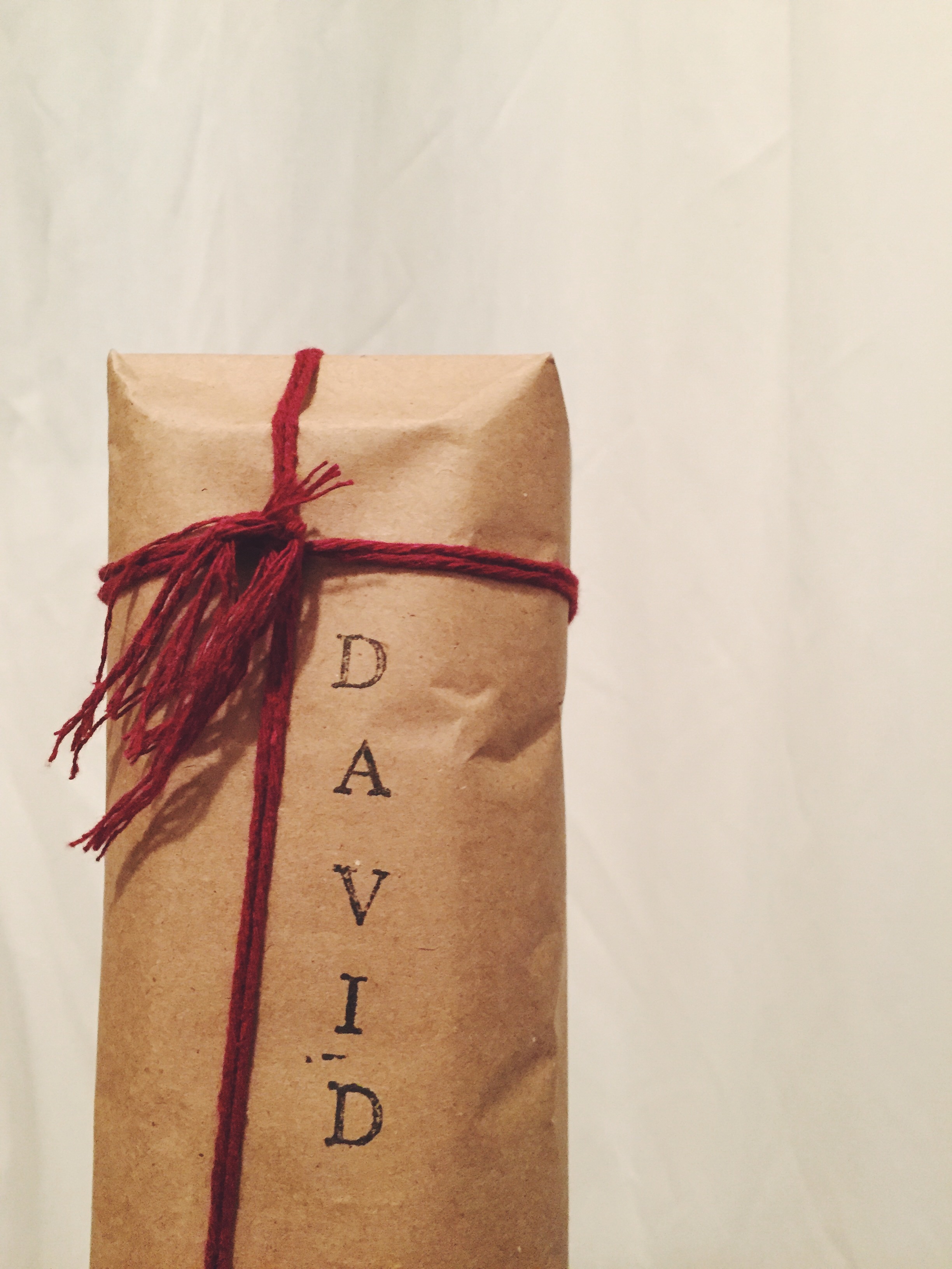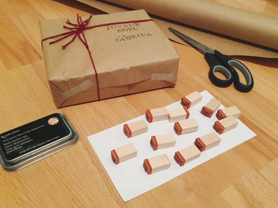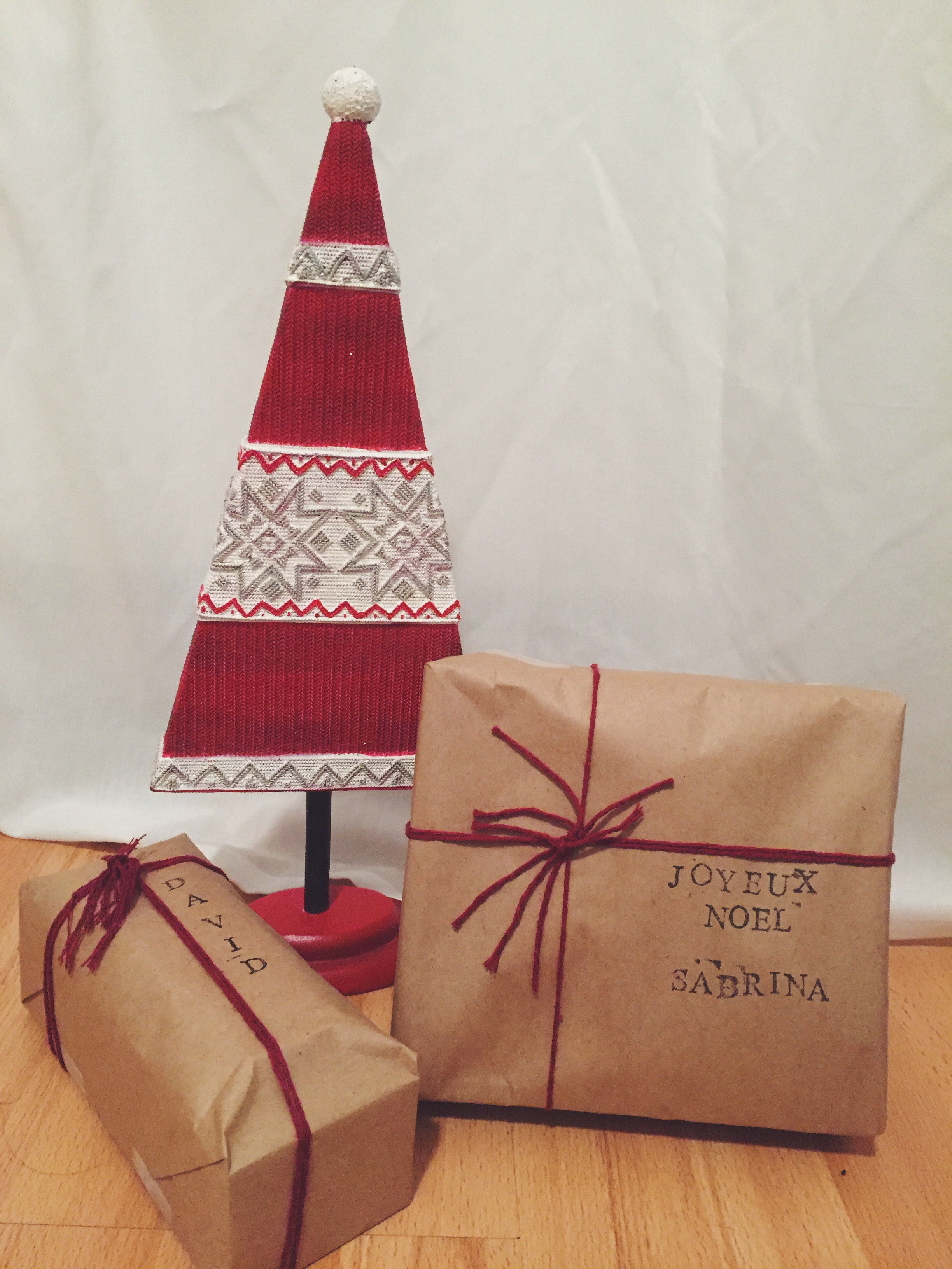 Qui dit achats des Fêtes dit emballage-cadeau et cette année, j’ai voulu faire dans la simplicité ainsi que dans le «très peu de frais». Il m’a tout de même fallu acheter un rouleau de papier brun, mais sinon, tout le reste m’attendait patiemment dans mon «atelier». J’avais acheté à la rentrée des classes un kit d’étampes des lettres A à Z et trois couleurs d’encre qui ont été bien utiles pour l’identification des cadeaux. Évidemment, j’avais déjà en stock du papier collant et de la laine rouge que j’avais utilisés pour des décorations antérieures. Le tout suffisaient à rendre ces emballages des plus mignons, à la mode et très vintage comme je les aime.