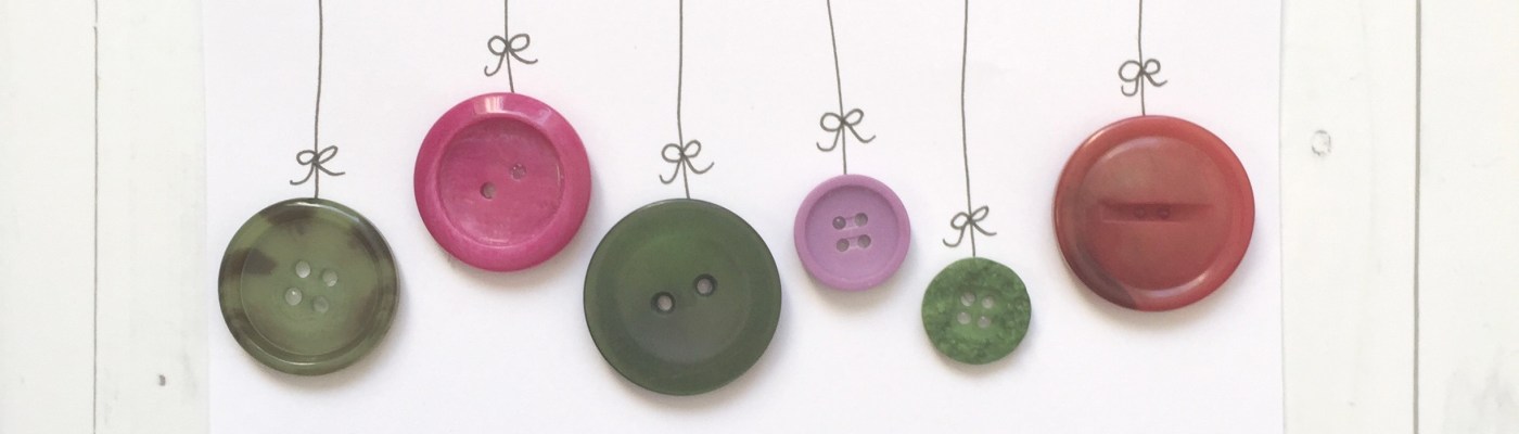 Pour le premier modèle, j’utilise des boutons rouges et verts que je colle en alternant les couleurs au centre de ma carte. Avec un feutre noir, je dessine des fils jusqu’au pli du papier avec de jolies boucles à la base. Il ne reste qu’à trouver le mot que je veux inscrire au centre et le tour est joué. Comme deuxième idée, on peut utiliser des étampes pour écrire le mot et du papier brun rigide au lieu du blanc.