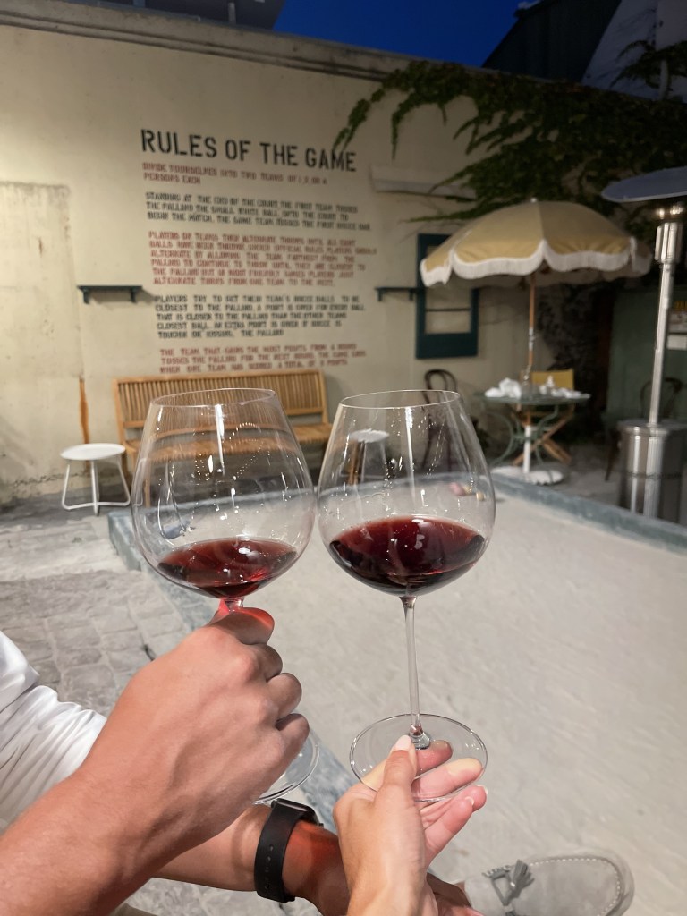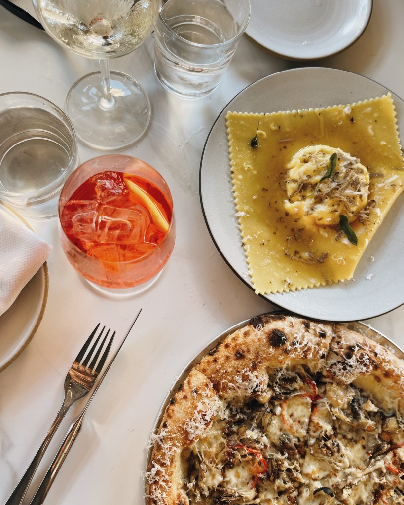 Notre première soirée en ville se fait plutôt «casual». On s’habille un peu «cute» et on prend la route vers le petit centre-ville. Nos recherches nous ont mené au restaurant italien, Molti Amici, le petit frère du Troubadour où on s’arrêtera plus tard dans notre périple. Ce resto plus abordable, avec de jolies petites tables et banquettes à rayures blanches et vertes poursuivaient notre état d’esprit d’être en plein coeur de l’Italie. Un restaurant intime à l’intérieur s’ouvrait sur une terrasse couverte et il y avait même, un jeu de bocce tout au fond de la court ! Si vous ne savez pas jouer, les règles sont inscrites sur les murs pour faciliter touts touristes à être de la partie. C’est un INCONTOURNABLE pendant que vous sirotez un Aperol Spritz ou après avoir savouré une pizza cuite au four, un raviolo fait maison… et peut-être en soirée, pour accompagner une bonne bouteille de vin rouge. 👀