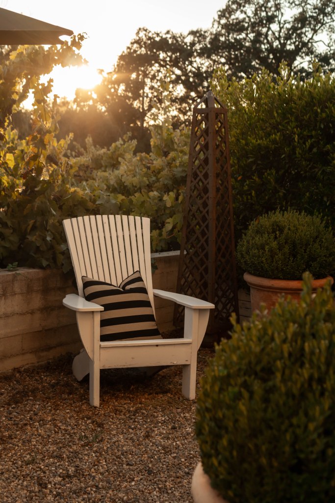 On avait accès à une petite terrasse avec des chaises Adirondack garnies de coussins blancs et à rayures, avec vue sur les vignes et un petit chemin de carré de béton qui menait à la piscine creusée.