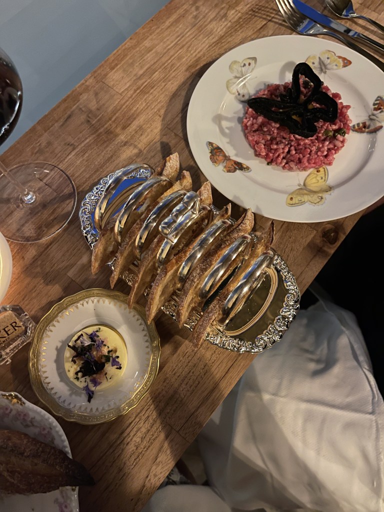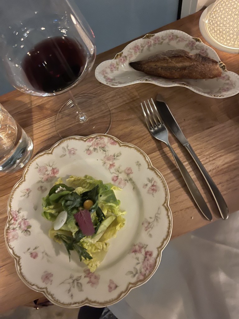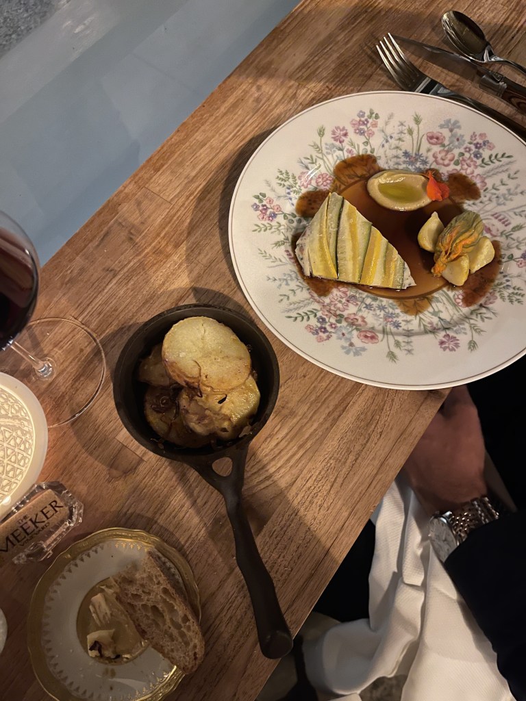 Ils n’ont qu’un menu qui change chaque jour où ils sont ouverts. C’est un repas de 6 services avec l’option d’ajouter un 7e si vous désirez du caviar Kaluga pour un supplément de 25$. Vous avez le choix parmi 3 ou 4 pour l’entrée ainsi que le repas principal. Nous avons évidemment choisi différents mets afin de goûter à «tout» et nous avons opté pour une bouteille de vin rouge Meeker.