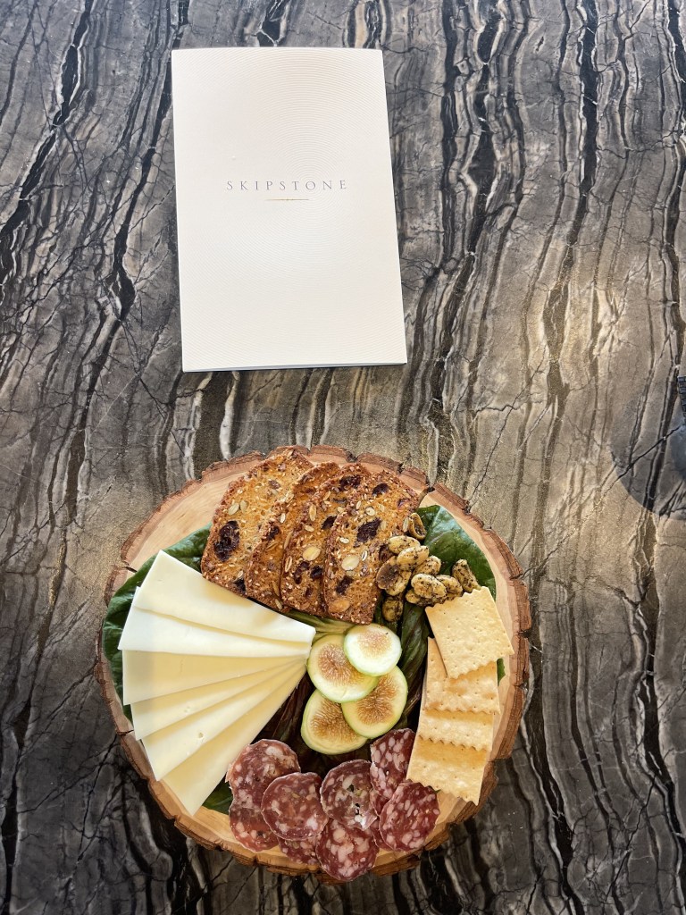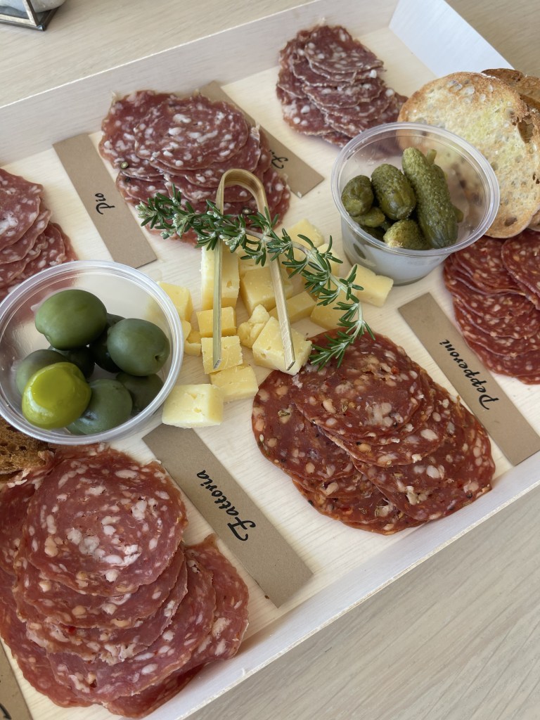 Nous avons fait l’expérience d’une dégustation de vin dans une salle privée avec vue sur un paysage de vignes et de montagnes. Trois verres à vins nous attendaient avec une planche de 6 types de charcuterie avec des olives, du pain et des fromages locaux. Miam !