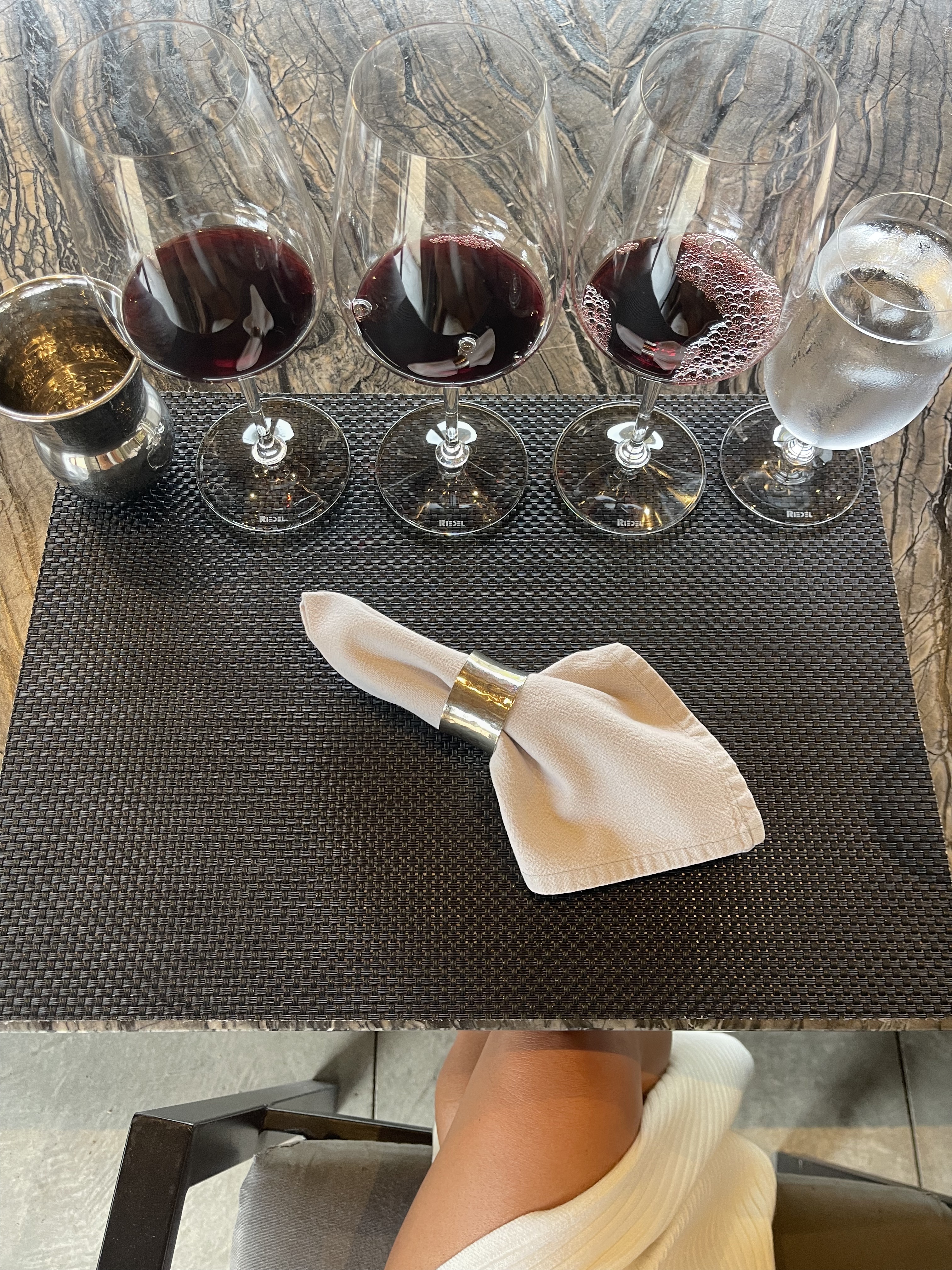 Nous avons fait l’expérience d’une dégustation de vin dans une salle privée avec vue sur un paysage de vignes et de montagnes. Trois verres à vins nous attendaient avec une planche de 6 types de charcuterie avec des olives, du pain et des fromages locaux. Miam !